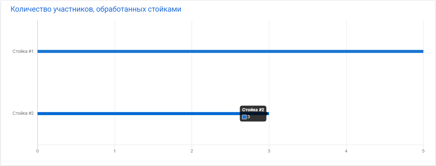 В пункте меню "по стойкам" отображается число обработанных посетителей каждой стойкой в отдельности. А так же поминутная статистика регистрации по каждой стойке.