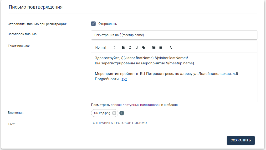 В письме можно настроить тему и текст письма, добавлять вложения - qr-код, бейдж, изображение в формате png.