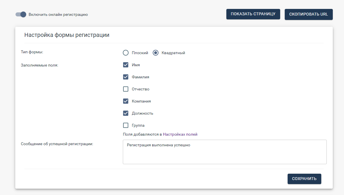 Выберите поля, которые должны отображаться на форме онлайн-регистрации.